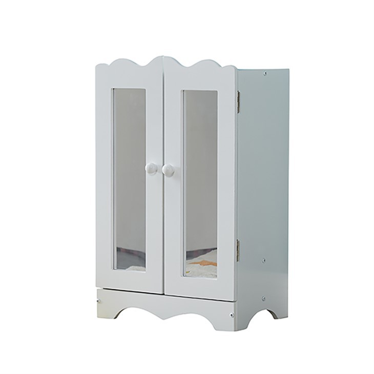 Doll Closet is een mooie en elegante manier voor kinderen om hun poppenkleertjes op te bergen. Het heeft de perfecte maat voor poppen van 18 inch en is voorzien van klassieke geschulpte randen en zes houten hangers - een mooie aanvulling op elke poppenkamer. De dubbele spiegel is gemaakt van veilig en duurzaam plastic en de houten constructie zorgt ervoor dat de kleine kast jarenlang speelplezier belooft.